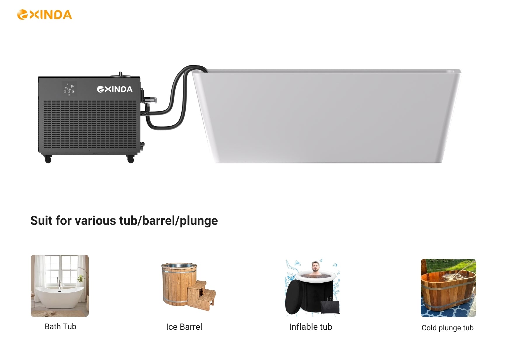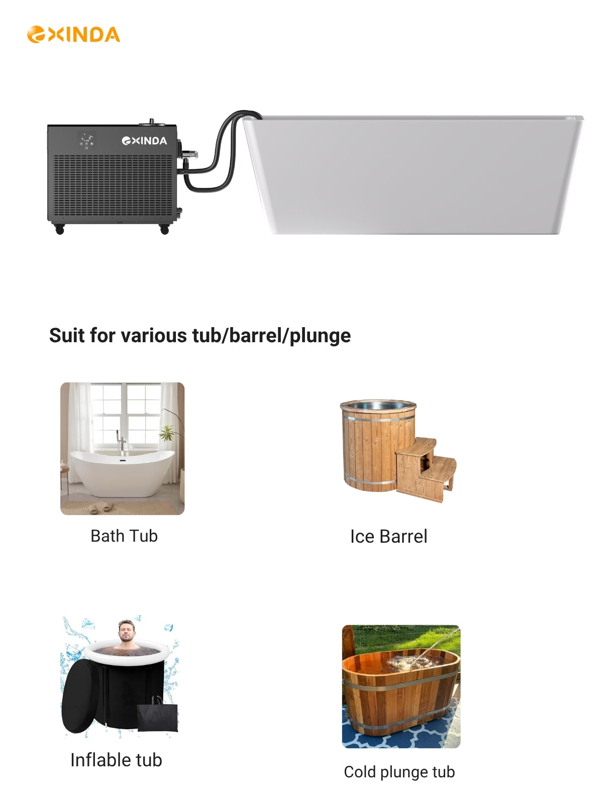 EXINDA ice bath chillers are designed to work with any type of tub—bathtubs, barrels, or plunge tanks. No need to buy a special cold plunge with built-in fittings. Just connect, chill, and enjoy cold therapy at home using your existing tub setup.