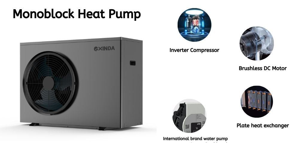 Exinda monoblock air to water heat pumps combine environmentally friendly R290 refrigerant and inverter technology to provide energy saving and high efficiency for heating/cooling and hot water, the circulation water pump is build in the heat pump. Helping saving installation time and cost.