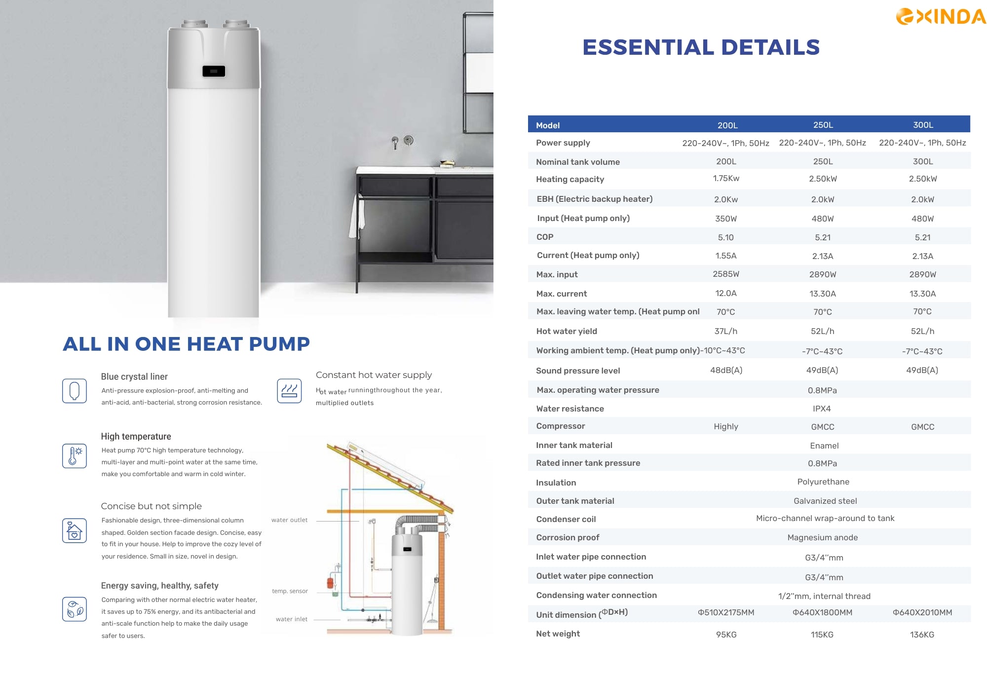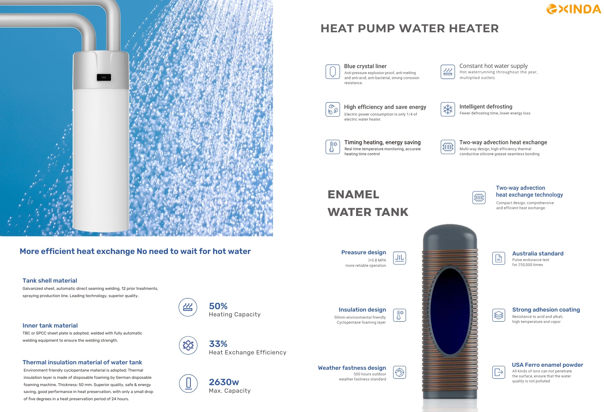 Experience next-generation hot water technology with the EXINDA All-in-One Heat Pump Water Heater. Engineered for superior efficiency, durability, and comfort, this system delivers constant hot water, ultra-low energy consumption, and long-lasting performance thanks to its advanced enamel water tank and intelligent heat pump system.